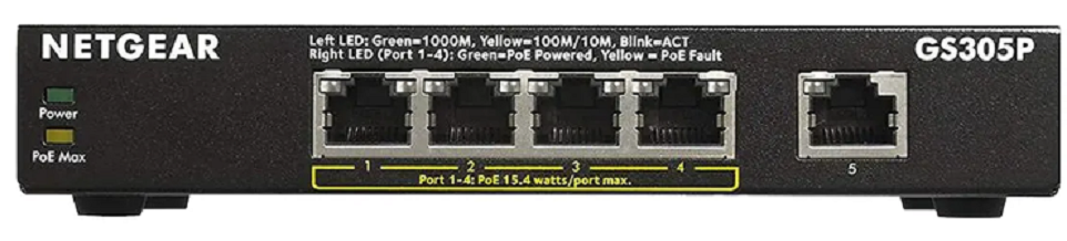 LEDs : Power, Link/Activity (Left), Ports 1-4: PoE Power (Right)